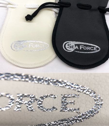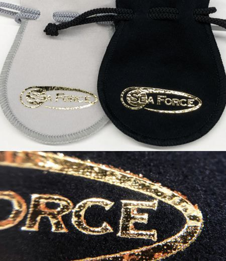金属を薄く展ばしたものを金型に付け、ケースやポーチに押し付ける方法です。金属のような光沢があるため、高級感を出すことができます。